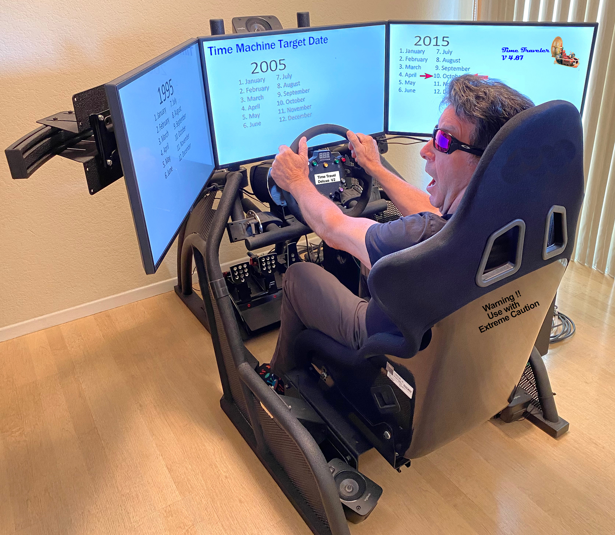 Tom has been testing the updated software, (Time Traveler V 4.87) and the new version of the Time Travel Deluxe V2 system, but he realizes that the risks are extremely high. So far he has been able to get back to the present, but by the look on his face he is understandably nervous!